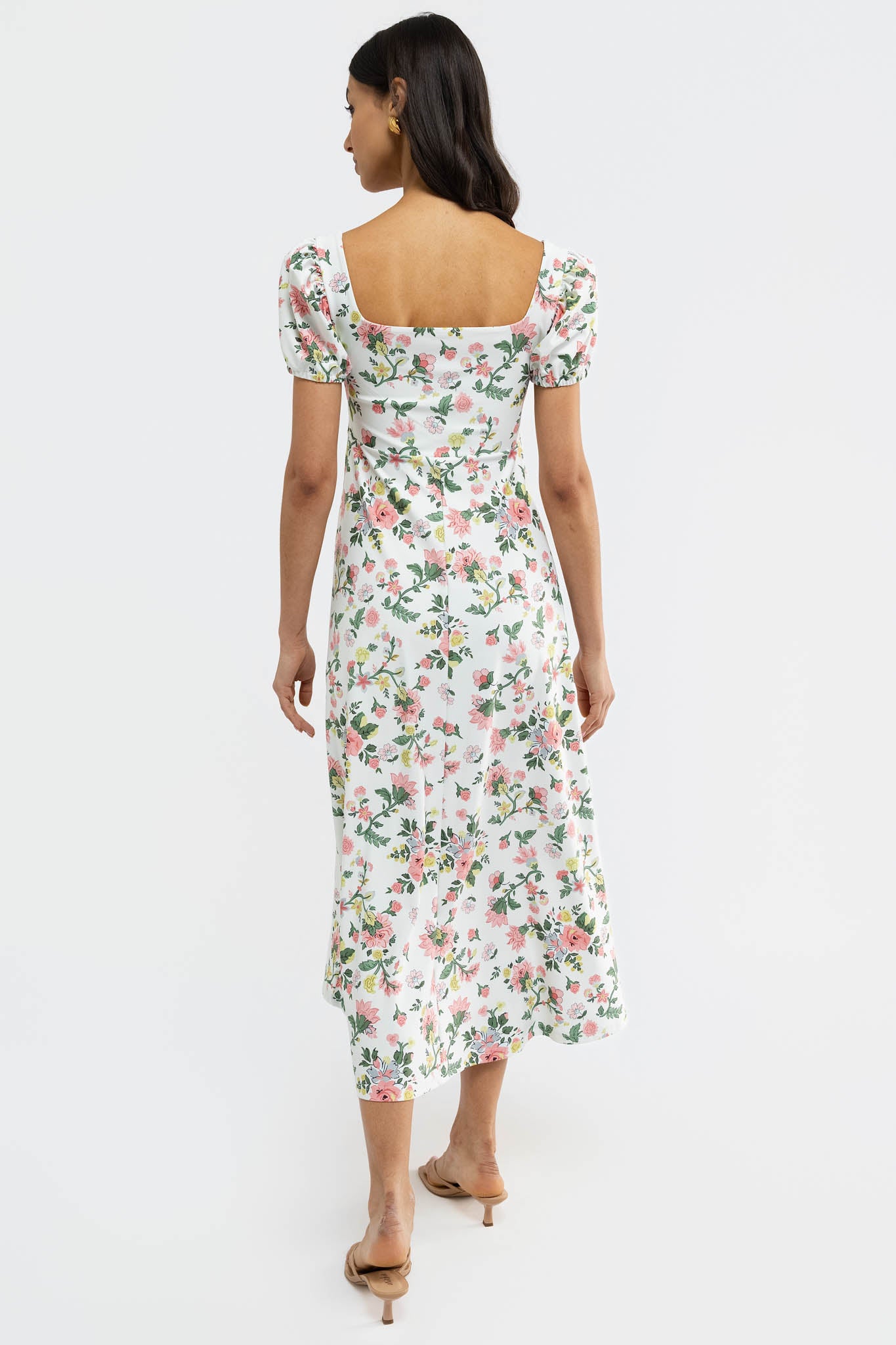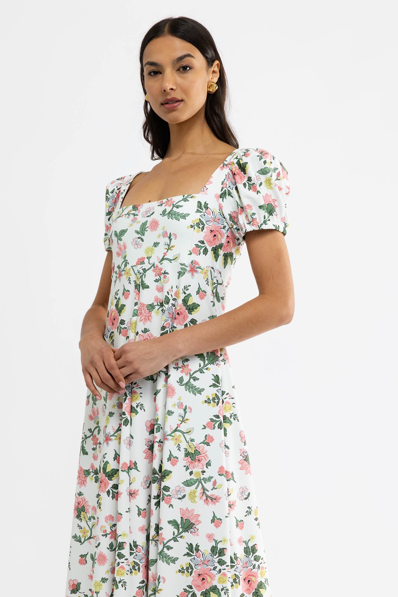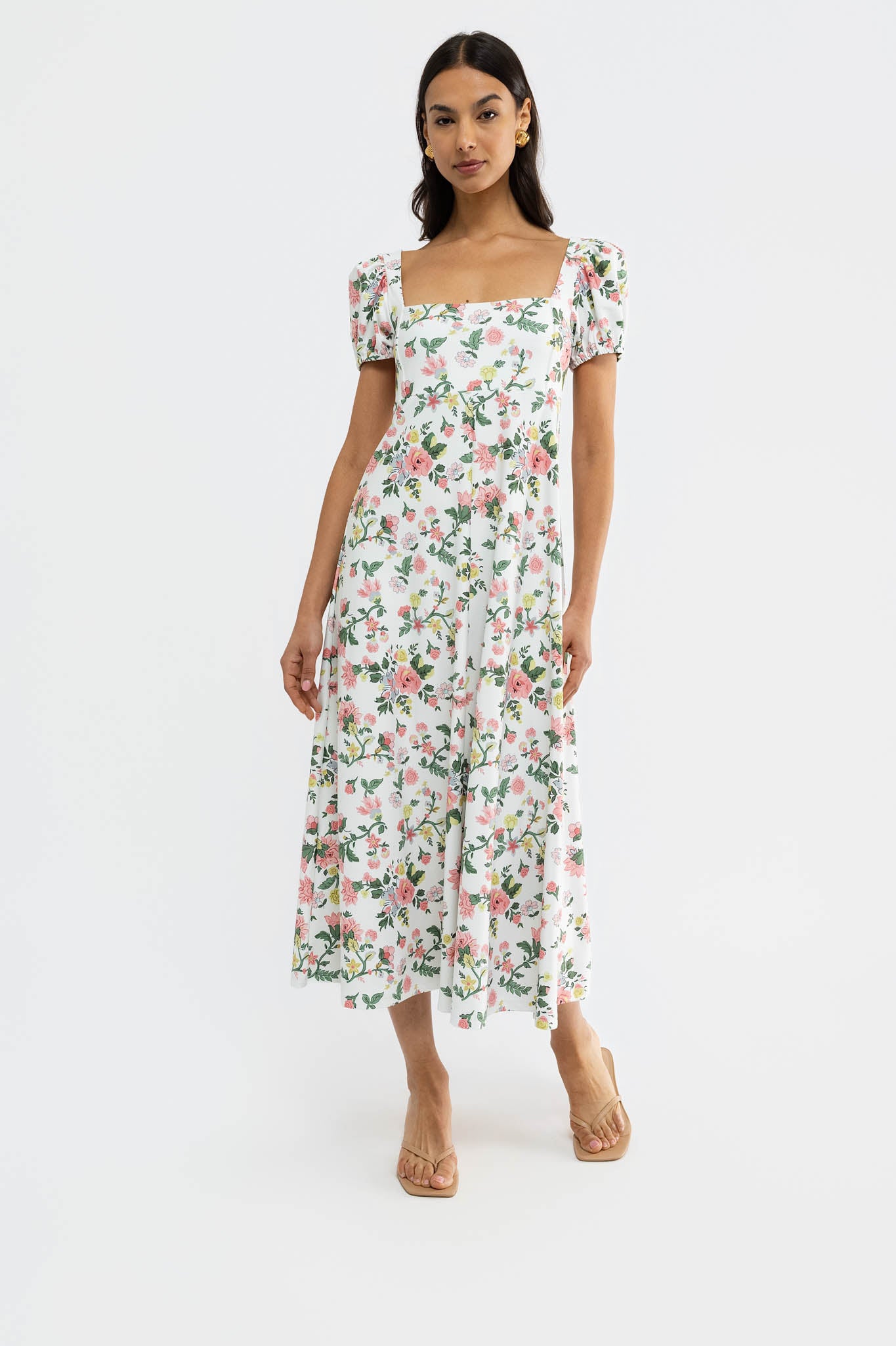 Meet the Rosalie Dress. Crafted from our S&Q Stretch fabric, the Rosalie features a romantic midi style with a flattering square neckline and puff sleeves.