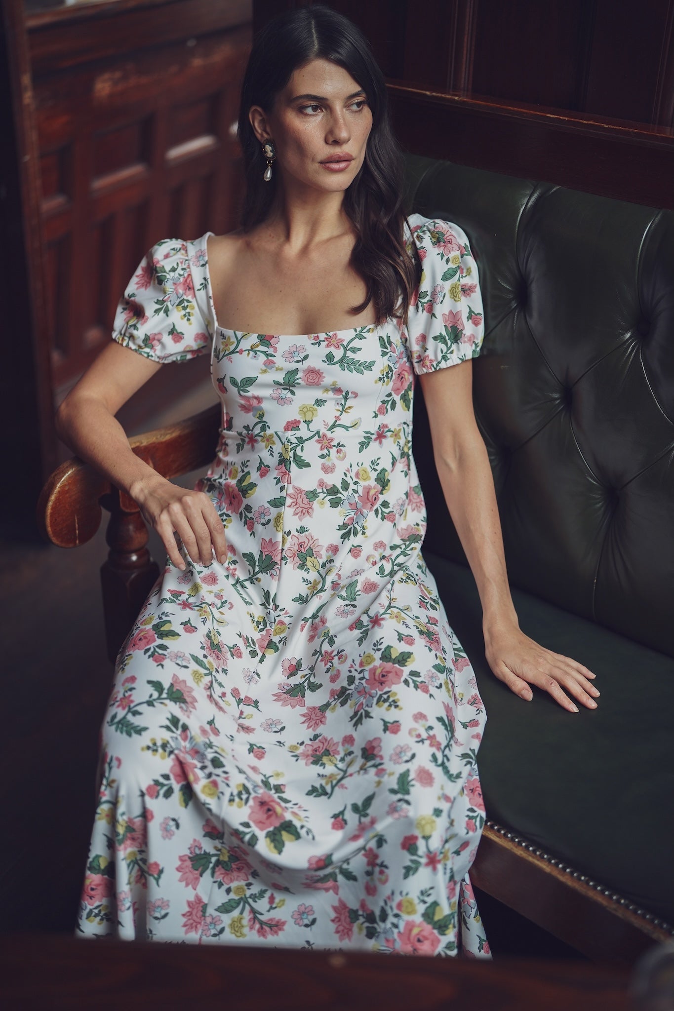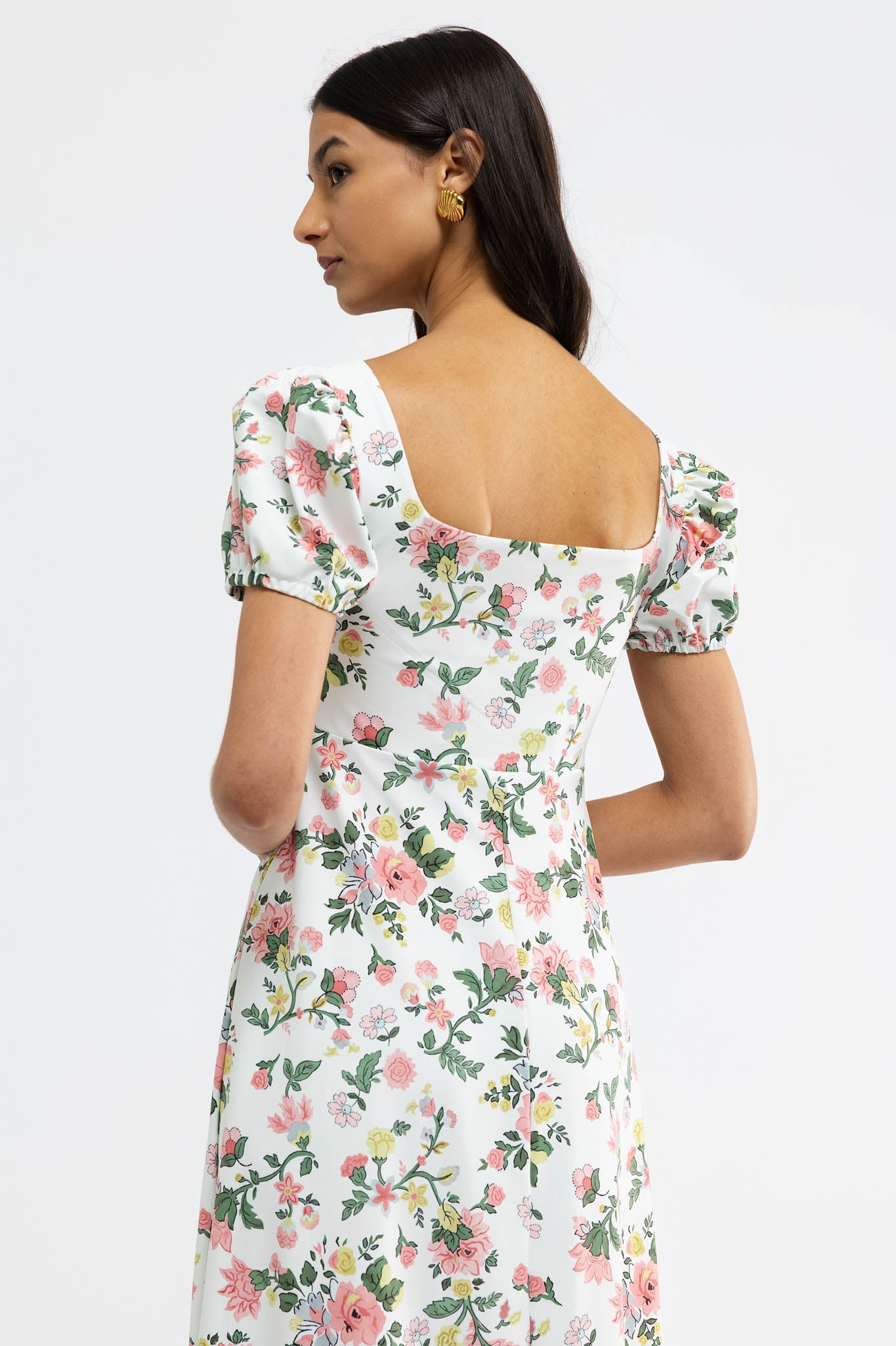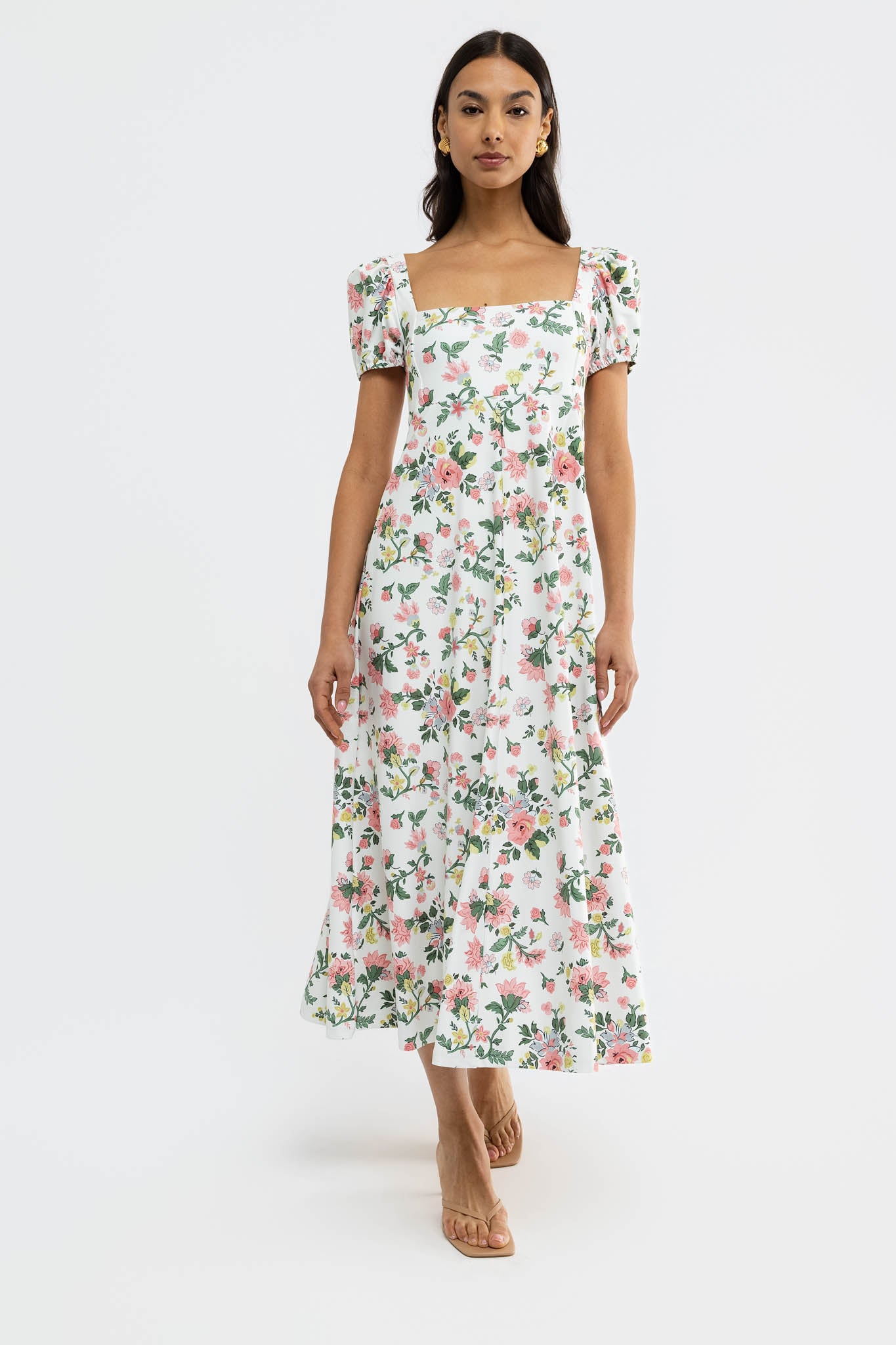 Meet the Rosalie Dress. Crafted from our S&Q Stretch fabric, the Rosalie features a romantic midi style with a flattering square neckline and puff sleeves.