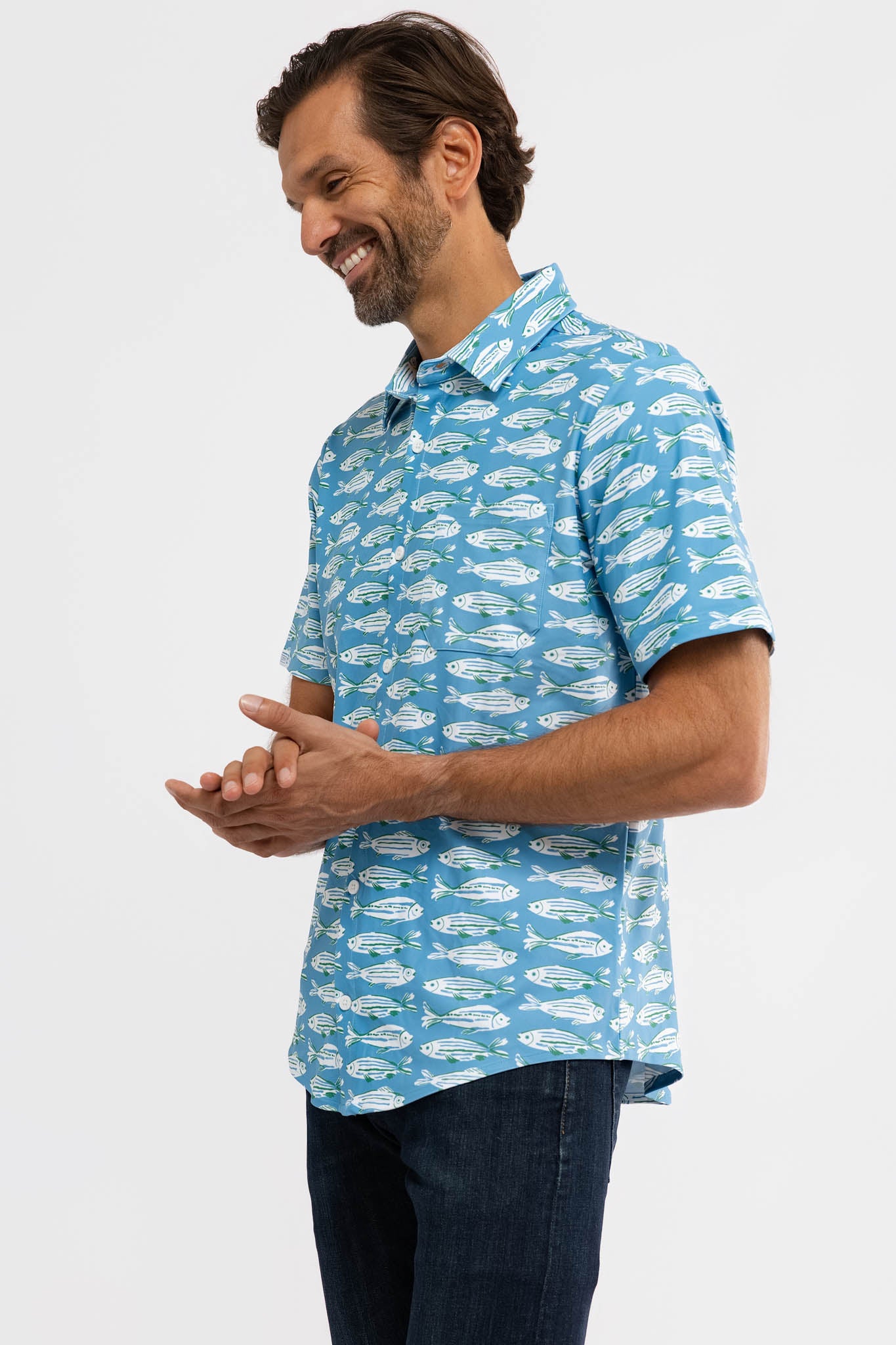 Meet the Boatyard Button-Down. Crafted from our S&Q Stretch fabric, the Boatyard features a versatile button-down style with a collared neckline and chest pocket.