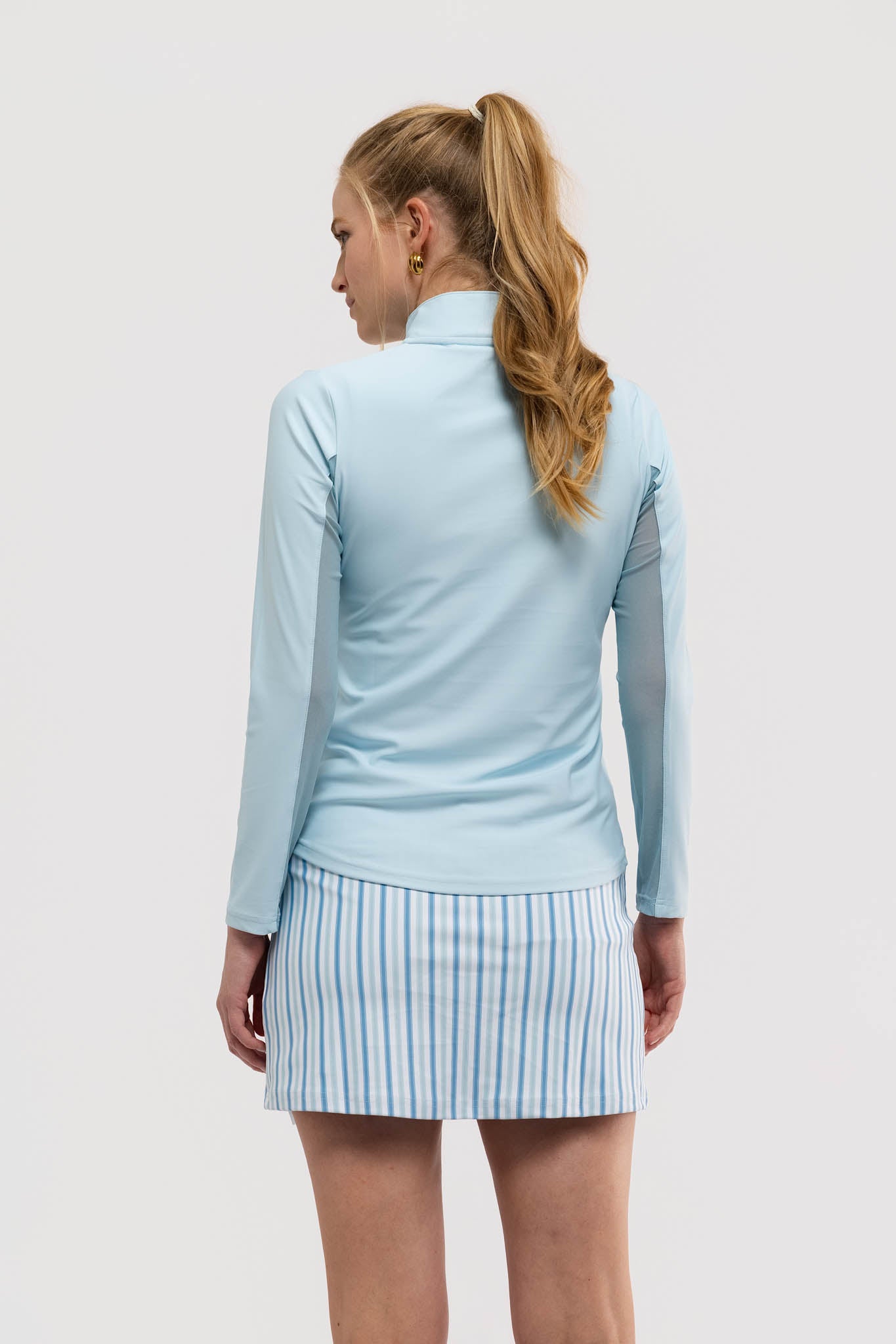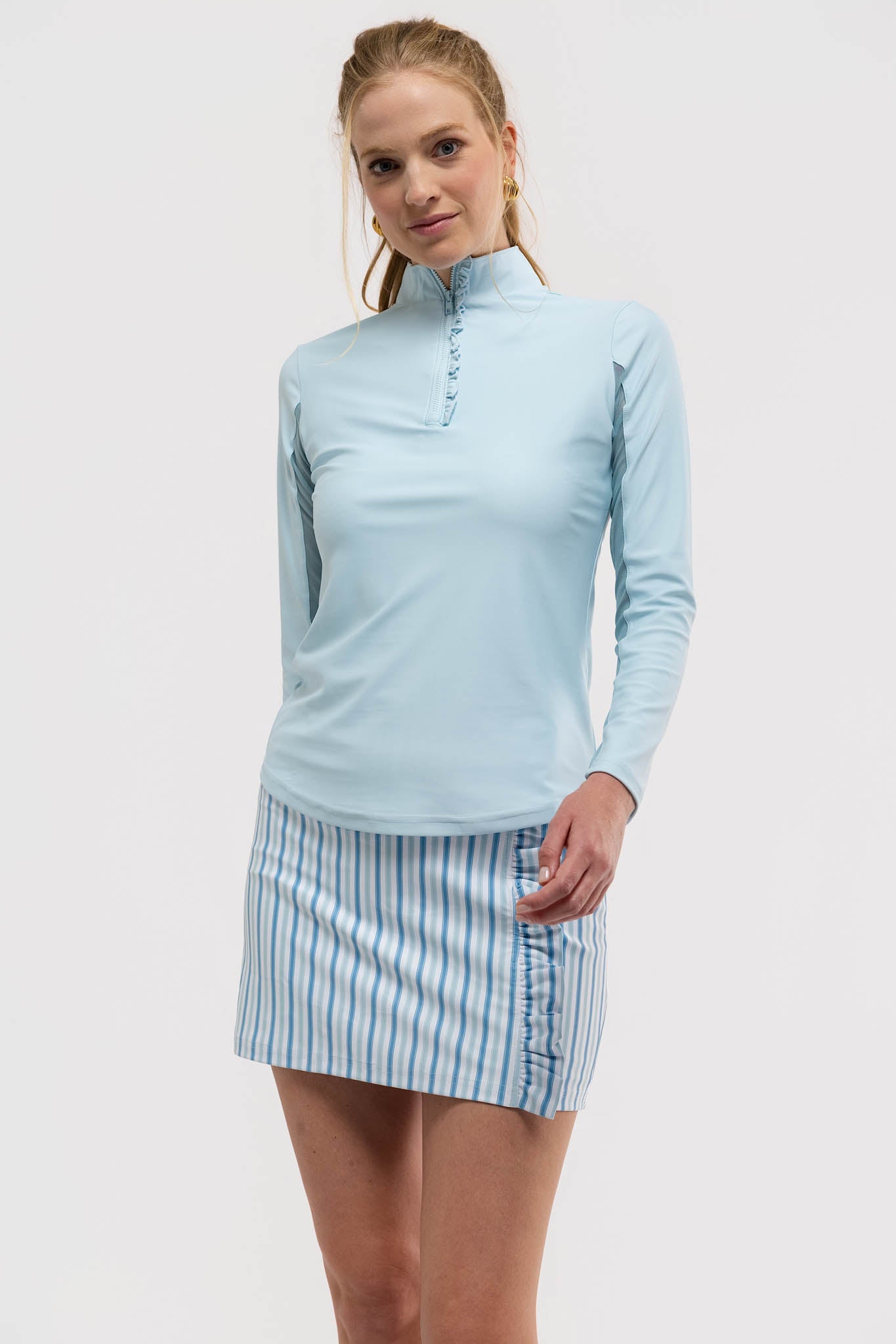 Meet the Ava Ruffle Quarter Zip. Crafted from our S&Q Stretch fabric, the Ava Ruffle features a lightweight quarter-zip silhouette, finished with a ruffle collar and breathable mesh panels at the underarms.